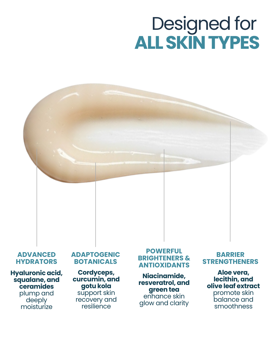 — Adaptogenic Botanicals – Cordyceps, curcumin, and gotu kola support skin recovery and resilience.